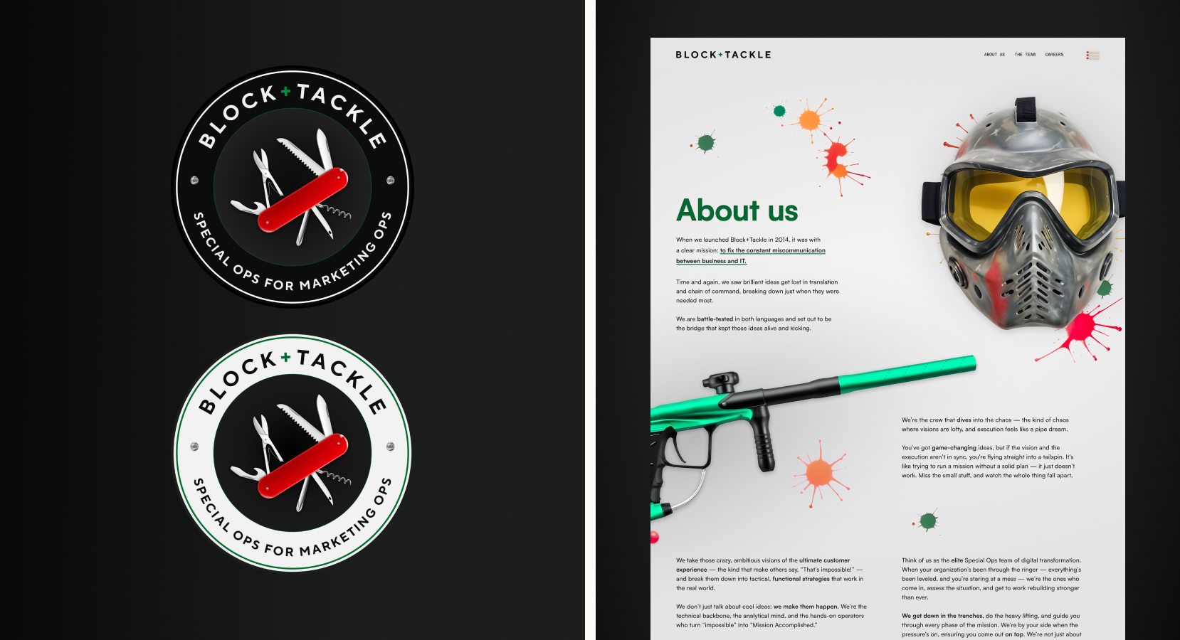 We gave Block + Tackle a brand with bite—elevated visuals wrapped around their signature grit and humor. Clean typography and a disciplined palette keep things high-end, while clever details and cheeky tonal moments add the surprise and delight they’re known for. A cohesive visual system ties everything together, drawing on MacGyver-style ingenuity and SEAL Team 6 precision to amplify their “special ops for marketing ops” positioning.